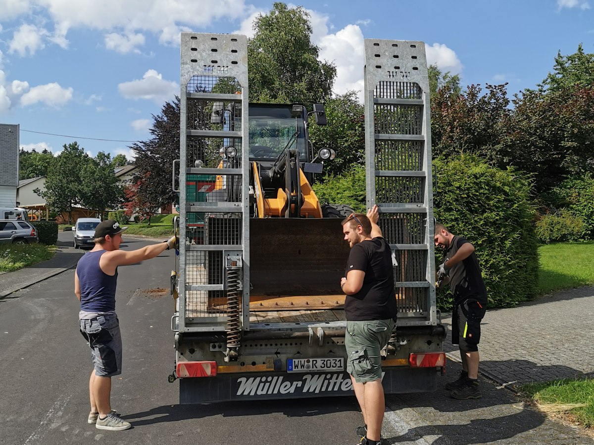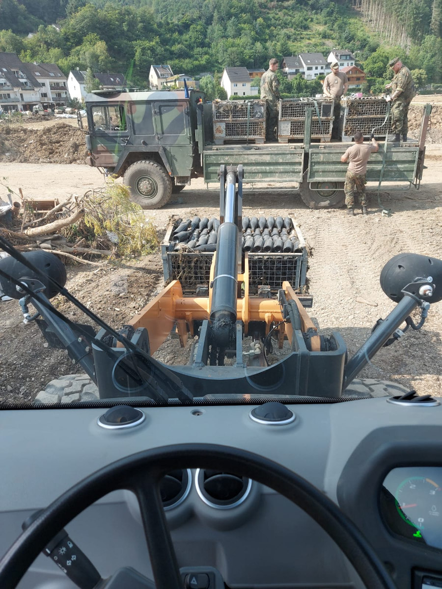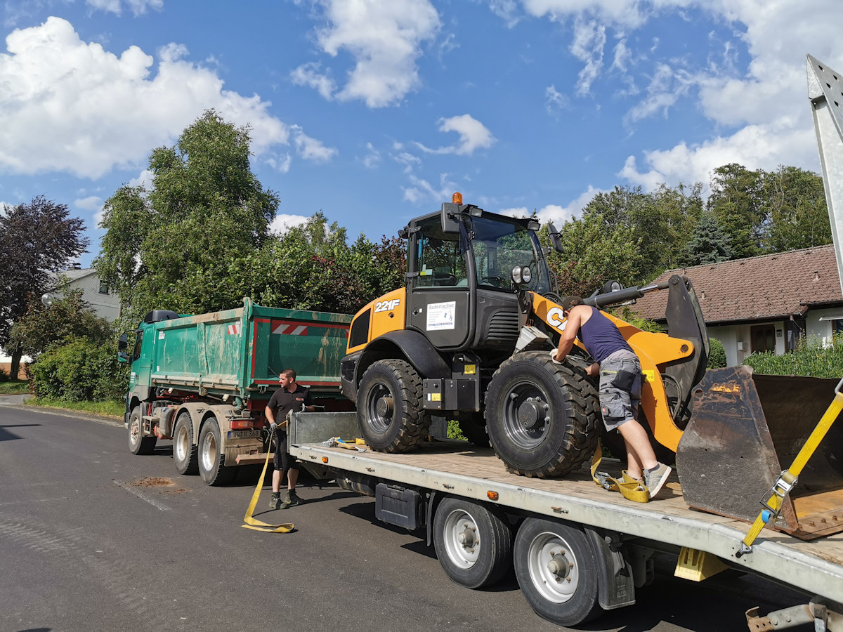 Sebastian hatte die Idee, den Homberger Radlader nach Resch zu schaffen und dort auch in der nächsten Zeit zu unterstützen. Er selbst war bereit, seinen Urlaub dort zu verbringen um den Radlader zu fahren. Der Gemeinderat stimmte zu und so wurde bereits am 26.07. der Radlader abgeholt.